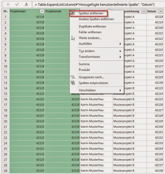 Query geladen wurde, sollte als nächstes der Datentyp der beiden Spalten Projektstart und Projektende in Ganze Zahl